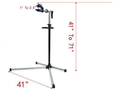 Features: Heavy duty construction and durable material. Quick release clamp locks bike in place. Telescoping stand. Clamp rotates 360 degrees with big gears. Tool tray with built-in magnetic compartment. Adjustable handlebar rod. Assembles in minutes; instruction, tools and hardware required.