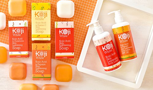 GET BACK THAT FLAWLESS, VIBRANT GLOW! Are you struggling with irritating sun spots, unsightly stretch marks, discoloration and freckles?Not anymore! Use Koji White Kojic acid soap daily to whiten your skin, remove dark spots and even out your skin tone naturally!