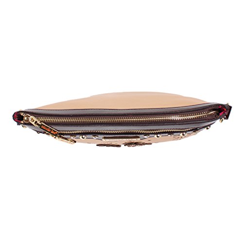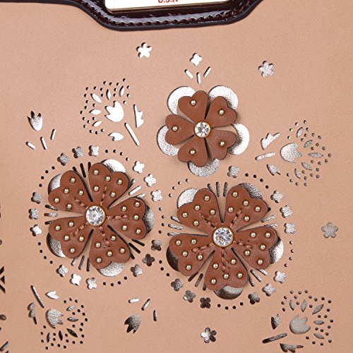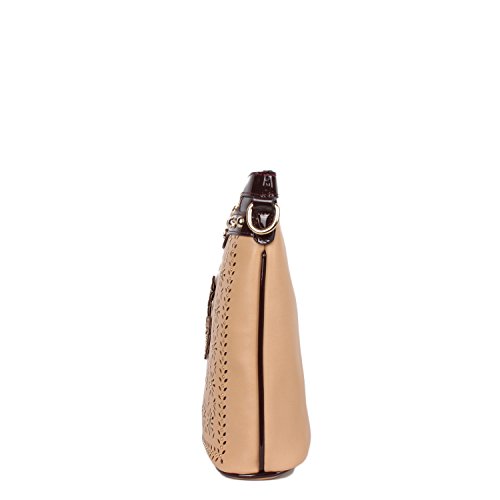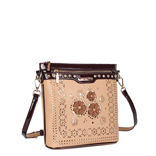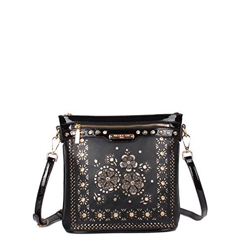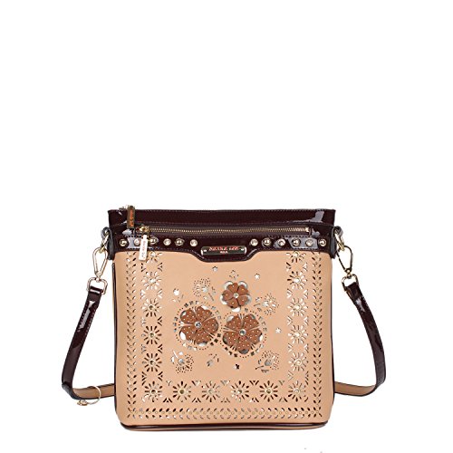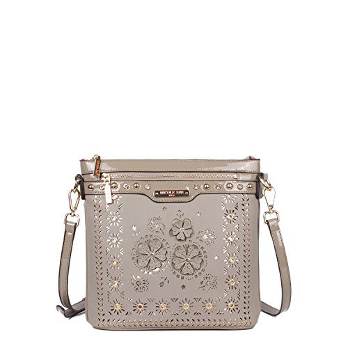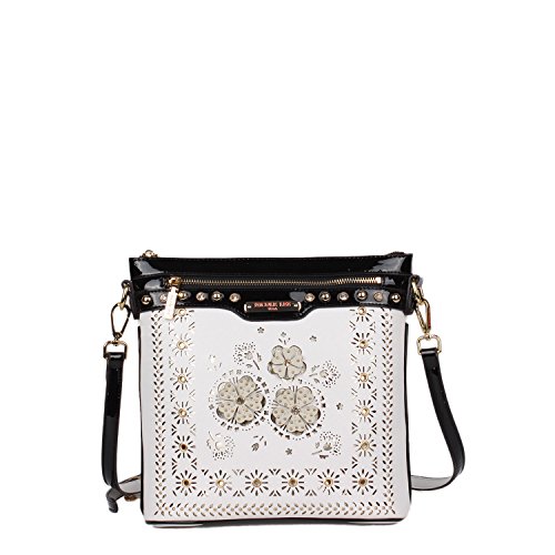 Product Description Nicole Lee Lael Floral Laser Cut Crossbody Bag is elegant and sophisticated, a definite must have! Exterior Features: Made of vegan leather, floral laser cut design at front with gold-tone background, gold-ton eyelet hardware and signature studs embellishments. This bag features a detachable shoulder strap, metal zipper closure with NL monogrammed zipper pull, zip front pocket, NL authentic medallion, structured silhouette and NL nameplate at front. Interior Features: zip wall pocket with NL nameplate at back, double open wall pockets at front, vegan leather key chain strap and NL pop stripe logo nylon lining. Includes adjustable and detachable 44" - 53" inch shoulder strap. Colors available are Black, White, Gray, Beige. For cleaning, wipe with damp cloth. 0
