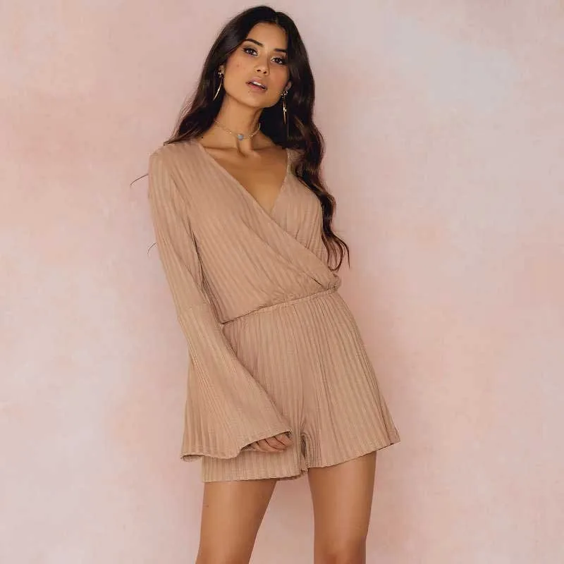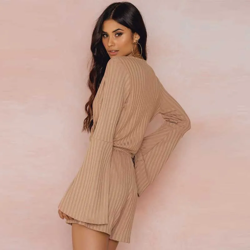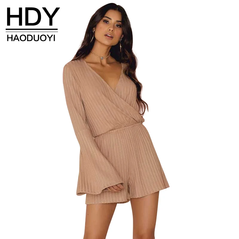 HDY Haoduoyi Solid Camel Fashion Romper Women Long Sleeve V-neck Female Casual Playsuit Loose Slim Ruffles Knitted Rompers | |||||||||||||||||||||||||||||||||||||||