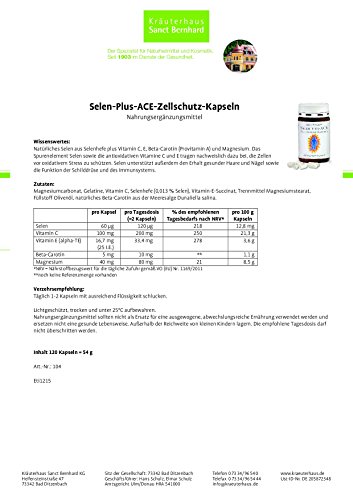 -. Binding : Badartikel -. Brand : Sanct Bernhard -. Feature : Nahrungsergänzungsmittel mit natürlichem Selen plus Vitamin C, E, A (Beta-Carotin) und Magnesium / Selen sowie die antioxidativen Vitamine C und E tragen dazu bei, die Zellen zu schützen -. IsAdultProduct : 0 -. Label : Kräuterhaus Sanct Bernhard -. Manufacturer : Kräuterhaus Sanct Bernhard -. MPN : 104 -. PartNumber : 104 -. ProductGroup : Drogerie & Körperpflege -. ProductTypeName : HEALTH_PERSONAL_CARE -. Publisher : Kräuterhaus Sanct Bernhard -. Studio : Kräuterhaus Sanct Bernhard -. Title : Selen-plus-ACE Zellschutz-Kapseln
