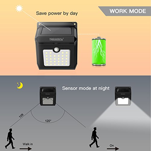 - 28 LEDs Ultra-Bright: There are 28 powerful LEDs and the motion angle is 120º which can provide an extra bright level of illumination in dark places. A necessity for you to protect your home and garden.