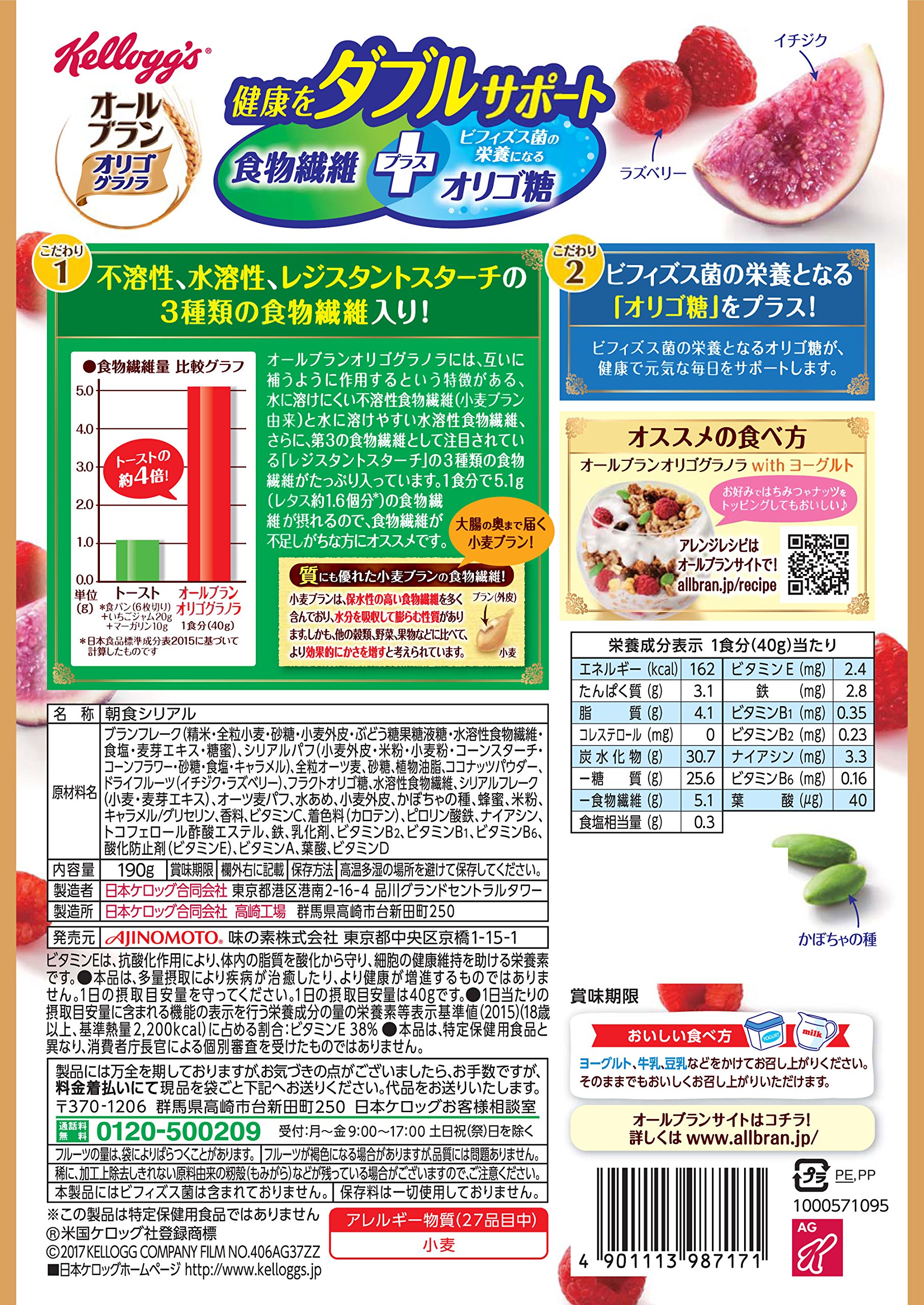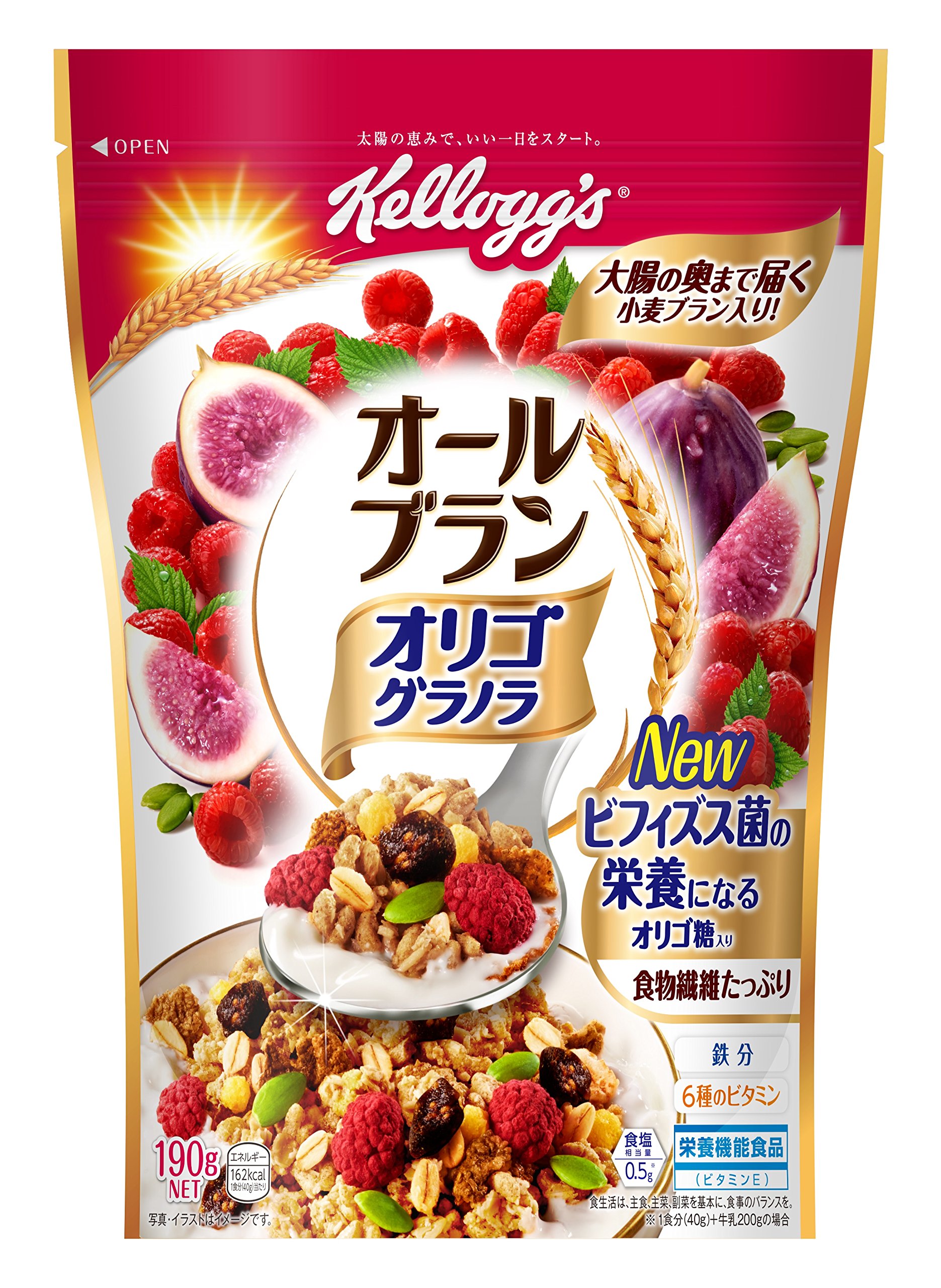 Olive Blan Oligranola is a fragrant crispy texture granola plus plus three kinds of dietary fibers (5.1 g per serving) and insoluble (wheat bran derived, water soluble, resistant starch) and oligosaccharide which is nutritious for bifid bacteria.
