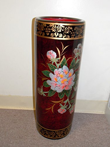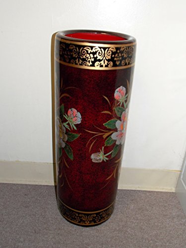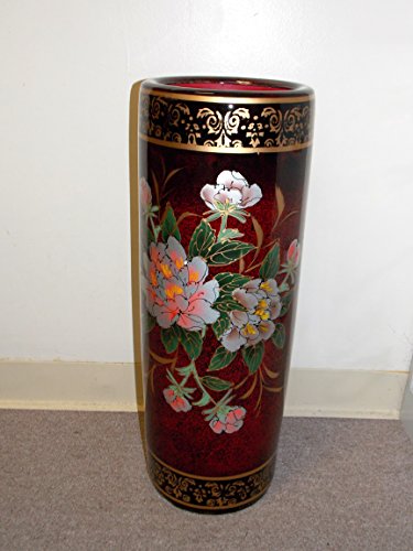 -. Feature : 24" Tall Umbrella Vase / Made out of Ceramic / Theme is of Asian Flowers on a Burgundy Colored Vase