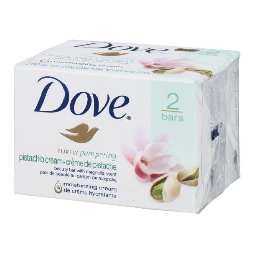 -. Feature : Dove® Purely Pampering Pistachio Cream Bars. Beauty bar with magnolia scent. 1/4 moisturizing cream. 2 bars. / New. 2-Net wt 4 oz (113g) bars. Dove® 1/4 moisturizing cream infused with a rich blend of pistachio cream melts deeply into dry, dull skin leaving it soft and smooth. Let the abundant, creamy lather and comforting scent of magnolia envelop your senses and leave you feeling relaxed and pampered. Use daily for deeply nourished, beautifully radiant skin. 1-800-761-DOVE. 1-800-761-3683. www.dove.com. ©Unilever.