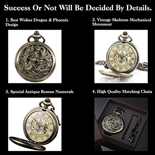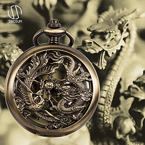 -. Feature : 1. Best wishes lucky Dragon and Phoenix pattern pocket watch, Skeleton dial, Bronze case, Good touch feeling, A fashion accessory. Perfect for Black Friday, Cyber Monday, Thanksgiving and Christmas Gift / 2. Mechanical hand-wound movement, No need to use battery, Twisting the top button on the spin, Tightening a walk for 24 hours / 3. 100% brand new with excellent workmanship, Precise mechanical golden movement / 4. Attractive vintage style design, It's an eye-catcher at the suit, pants or dress / 5. Comes with chain and gift box, Nice gift for your family or your friends, Seniority for yourself