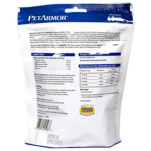 PetArmor for Dogs Joint -Eze ADVANCED is formulated to help nourish, support and maintain the health of your pet's joints and cartilage. Also contains MSM. Product is available in a 60 count reusable bag.Feature
