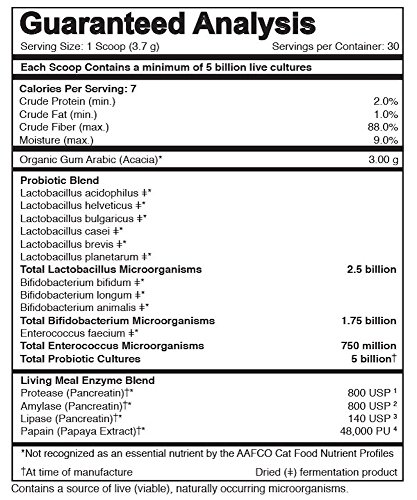 -. Feature : CONVENIENT POWDER: Our convenient powder is easy to sP.R.Inkle on your cat's food. With a simple scoop, you can add live probiotics, enzymes and a special blend of superfoods to Bring Your Cat's Food to Life! / ORGANIC SUPERFOOD BLEND: Our organic superfood blend includes turmeric, cranberry, noni, pomegranate, raspberry, cherry and watermelon. / BENEFICIAL ENZYMES: Helping to break down food and assist in the absorption of essential nutrients, our enzymes support a healthy and natural balance in the gut. / 5 BILLION LIVE CULTURES: With 5 billion live probiotic cultures in each scoop, our blend of living, raw probiotics help maintain proper gut flora and support the protective layers of the bowel.