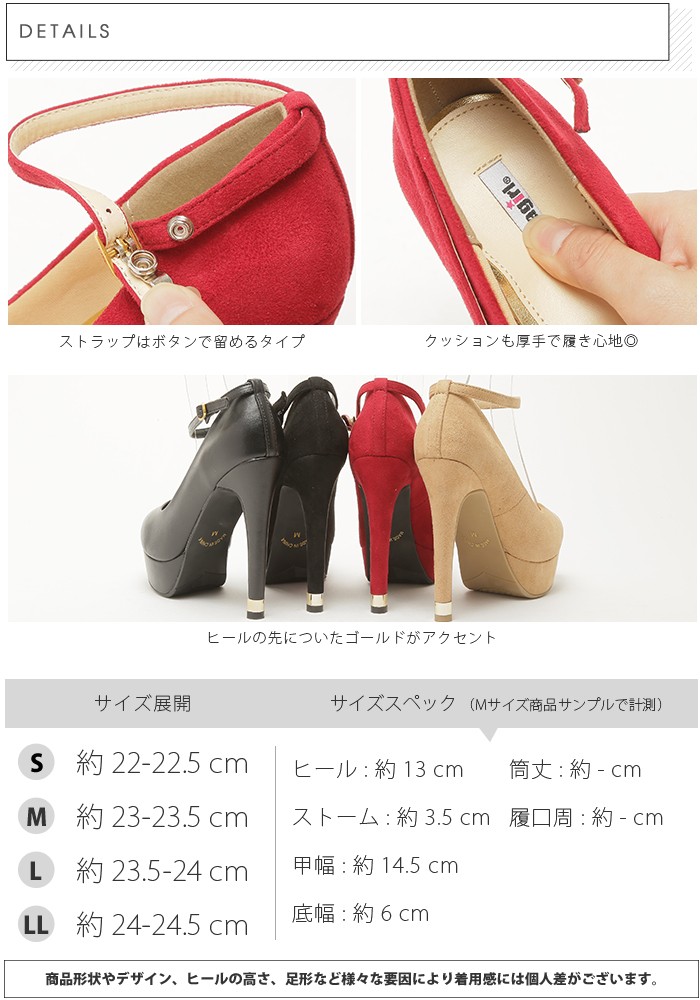 | カラー | 01. ブラックスムース 02. ブラックスエード 03. ベージュスエード 04. レッドスエード |