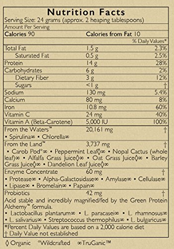 -. Feature : Complete, highly utilizable, Vegan protein containing all essential amino acids in proportions very similar to human breast milk / All ingredients are enzymatically active, as they have NEVER been heated. With additional enzymes added to the formula, Green Protein AlchemyTM is loaded with enzymes and is thus extremely easy to digest. / Hypoallergenic, unlike whey and soy protein which contain common allergens / Contains unique phytonutrient known as Chlorella Growth Factor (CGF) that supports improved tissue oxygenation and athletic performance. / Massive amounts of chlorophyll helps to build healthy blood and oxygenate bloodstream.