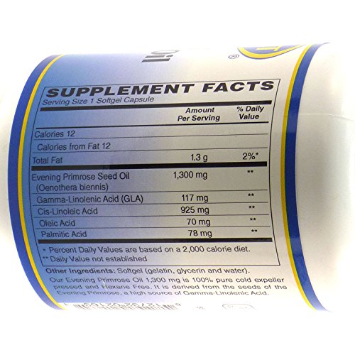 Studio : Vitamin Discount Center Publisher : Vitamin Discount Center Product Description Our evening Primrose Oil 1,300 mg is 100% pure cold expeller pressed and hexane free. It is derived from the seeds of the Evening Primrose, a high source of Gamma-Linolenic Acid. As a dietary supplement, adults take one (1) softgel, two (2) or three (3) times daily with meals, or as directed by a health care professional. Store in a cool, dry place and away from direct light. These statements have not been evaluated by the Food and Drug Administration. This product is not intended to diagnose, treat, cure, or prevent any disease. 0