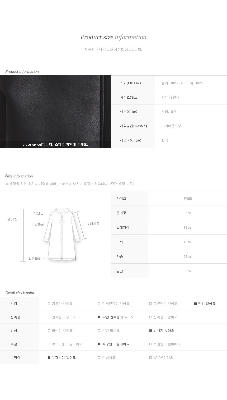 폴리에스테르100% 탄탄한 소재로 제작된 롱 무스탕이에요