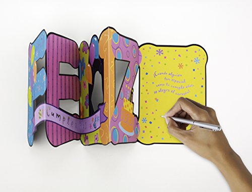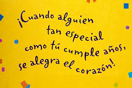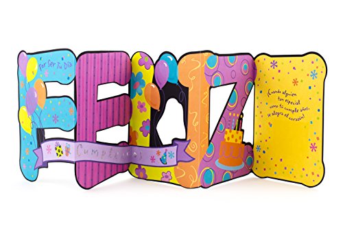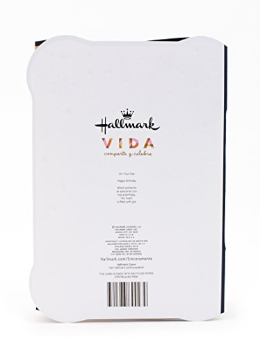 Studio : Hallmark Marketing Company, LLC (Office) Publisher : Hallmark Marketing Company, LLC (Office) Binding : Office Product Product Description Send a fun and memorable birthday greeting to family, friends, coworkers, or other special people with this card featuring a giant blue "F" accented with colored balloons and stars. The message on the front of the card reads, "Por Ser Tu Dia." Open the card to reveal the inside message, "FELIZ Cumpleanos ¡Cuando alguien tan especial como tu cumple anos, se alegra el corazon! " The card measures 9.4 inches long by 6.6 inches wide made with high quality cardstock paper; an envelope is included. All Hallmark cards are made with paper from well-managed forests. Hallmark VIDA helps Latinos connect in meaningful and memorable ways with cards that clearly reflect their values. Through relevant images and editorial, the line speaks both the language and the culture. Hallmark was founded in 1910 when 18-year-old J.C. Hall arrived in Kansas City, Missouri, with a couple of shoeboxes of postcards under his arm and the American dream in his heart. Hallmark greeting cards are sold online and in nearly 40,000 retail stores across the globe and people continue to recognize the iconic Hallmark brand as "the very best." 0