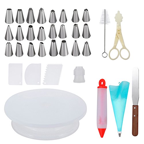 Cake Decorating Supplies with Cake Turntable 24 Stainless piping nozzles 1 Icing Spatula 1 Pastry Bag 1 Cake Brush 1 Cake Cutter 1 Cake Pen 3 Cake Scrapers cake stand
