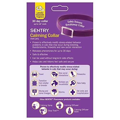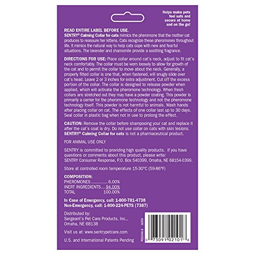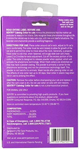 -. Feature : Helps reduce separation anxiety, excessive meowing, destructive behavior & inapproP.R.Iate marking / Sustained released pheromones are proven effective to last up to 30 days / Fresh, soothing lavender chamomile fragrance / Cat calming aid for cats & kittens with necks up to 15" / Non-toxic formula
