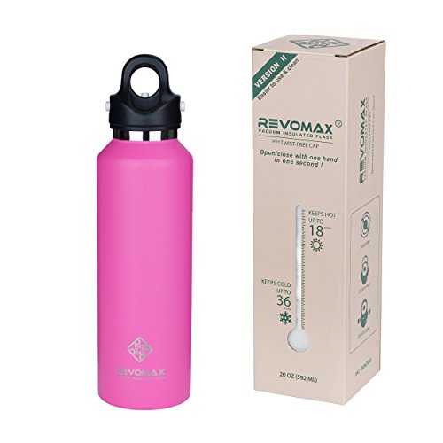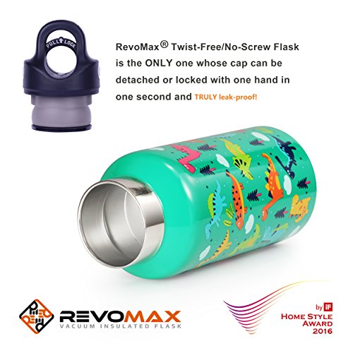 If you are tired of tedious screwing and unscrewing of an insulated water bottle with a traditional screw-cap and frustrated with the mess in your bag caused by an unsecured water bottle, RevoMax Twist-Free stainless-steel bottle, an iF Design winner could be the ultimate solution! With a screw capped vacuum insulated water bottle, for each small sip of coffee or hot chocolate, you may spend 10 to 20 seconds attempting to twist the cap open. A RevoMax lid can be fully detached or securely locked in less than 1 second single-handedly! A screw cap is tightened by twisting, but how hard should you twist it? The harder you screw it on, the harder you will need to unscrew it. If a water bottle is holding carbonated beverage or a lot of steam inside, it is even harder to unscrew. With RevoMax, constant force is automatically applied to the silicone seal as long as you pull the locking handle up until the middle safety button pops up. Therefore, no more leaks or loose caps. Every RevoMax lid is equipped with an air exhaust valve to relieve the pressure just before the cap is opened. There is no popping or struggling to unscrew the bottle even holding a carbonated beverage. Compared to a water bottle with a traditional screw-cap, RevoMax twist-free/thread-less flask is like a zipper, simply faster and better! Every RevoMax double walled water bottle has internal copper coating and is double sealed at its opening for better isolation, so its thermal performance is 50% better than most leading brands in its class! With RevoMax, your coffee stays piping hot for an entire day or your ice water stays cold for a couple days! Easy to Use and Clean RevoMax has spent two years implementing changes to improve the twist-free lid to ensure that it is user-friendly and easy to clean. Now, no mistake can be made during use, and no complicated instructions are needed for disassembly and reassembly. Hope you enjoy your RevoMax products, which will improve the way you stay hydrated!Feature