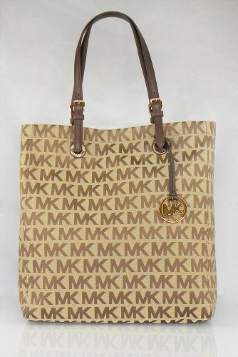 Beige Michael Kors monogram block print jacquard with mocha brown leather trim and golden hardware
