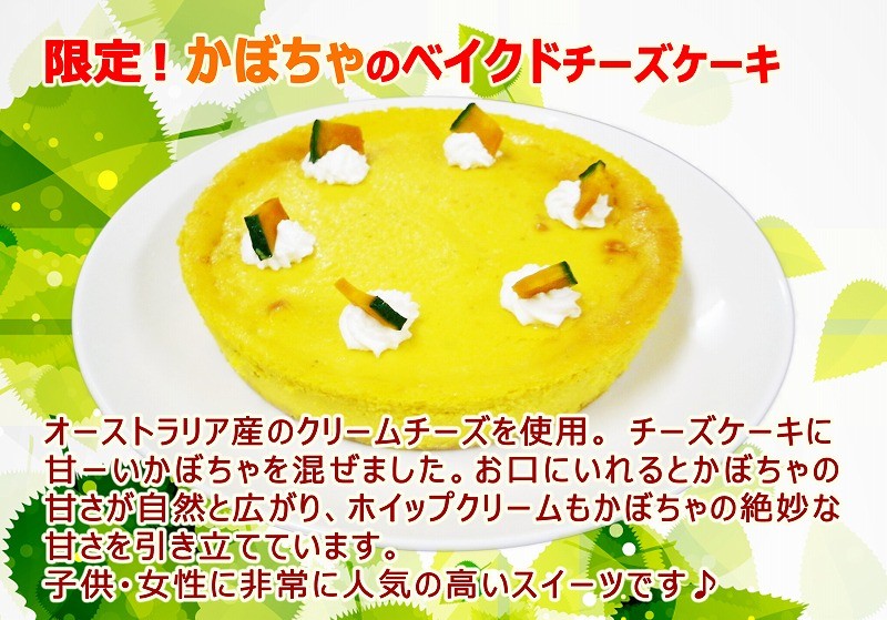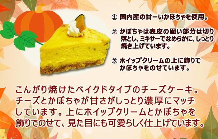 かぼちゃのベイクドチーズケーキ♪かぼちゃとチーズケーキのコラボ♪かぼちゃは表皮の固い部分は切り落とし、ミキサーでなめらかにしっとり焼き上げています。お口にいれるとかぼちゃの甘さが自然と広がり、ホイップクリームもかぼちゃの絶妙な甘さを引き立てています。お子様や女性に大人気です♪スイーツギフトにもどうぞ♪【サイズ】5号 15cmホール 380g【原材料】クリームチーズ・生クリーム・砂糖・かぼちゃ・小麦粉・卵・バニラエッセンス・ホイップ・バター・クッキー【賞味期限】冷凍:発送日から1ヶ月(解凍後2日:解凍は冷蔵庫で4~8時間程度、解凍時に若干ボトム部が湿っぽくなりますが味に支障はありません。)