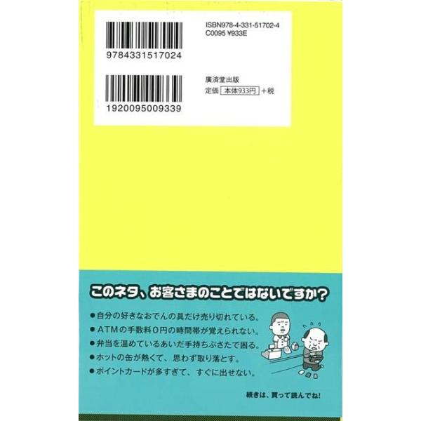 【商品説明】 定価(税込み):1,008円 値引き:10% OFF 「店舗よりも駐車場が広い店がある」「どのカップ麺が美味いか聞いてくる客がいる」「立ち読みしてると店内BGMが頭にまとわりつく」……など若者からお年寄りまで日本人の生活に密着したコンビニの「あるあるネタ」を楽しい漫画とともに紹介。 バーゲンブック 新品 特価 格安 エンターテインメント 雑学 生活 日本 |