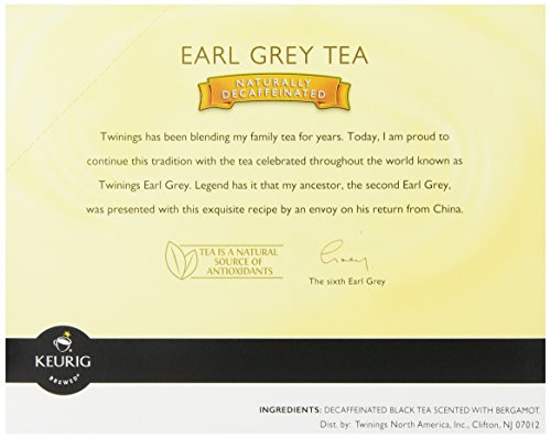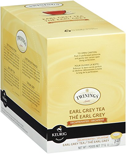 Feature : 25-Count of Twinings Earl Grey Decaffeinated Tea / The same great taste of Earl Grey tea, without the caffeine / A light and aromatic blend of fine black tea, scented with bergamot, a citrus fruit / Decaffeinated, naturally / Not compatible with Keurig 2.0 brewers