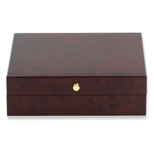 The logan man's chest has a dark elm burl satin finish and thatch faux suede lining. Its compartments hold all of a man's basics jewelry accessories as well as cell phone, money clip and pocket knife.