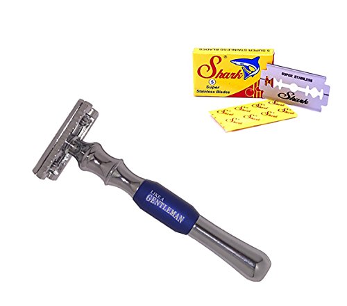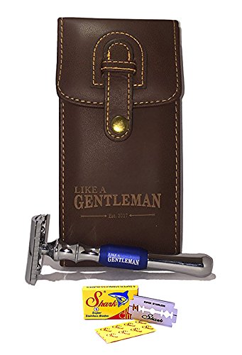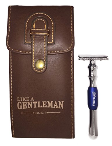 LIKE A GENTLEMAN Double Edge Wet Shave Safety Razor + Genuine Leather Travel Case with Compartments (Royal Blue)