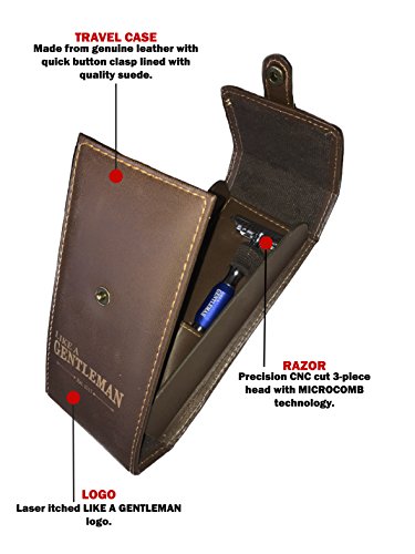 BONUS GENUINE LEATHER TRAVEL CASE AND 5 PACK RAZOR BLADES – Premium quality leather Travel case with quick button clasp lined with quality SUEDE with additional compartment perfect for getting a quality shave on the go. 5 Pack Razor Blades will be shipped separately with every order