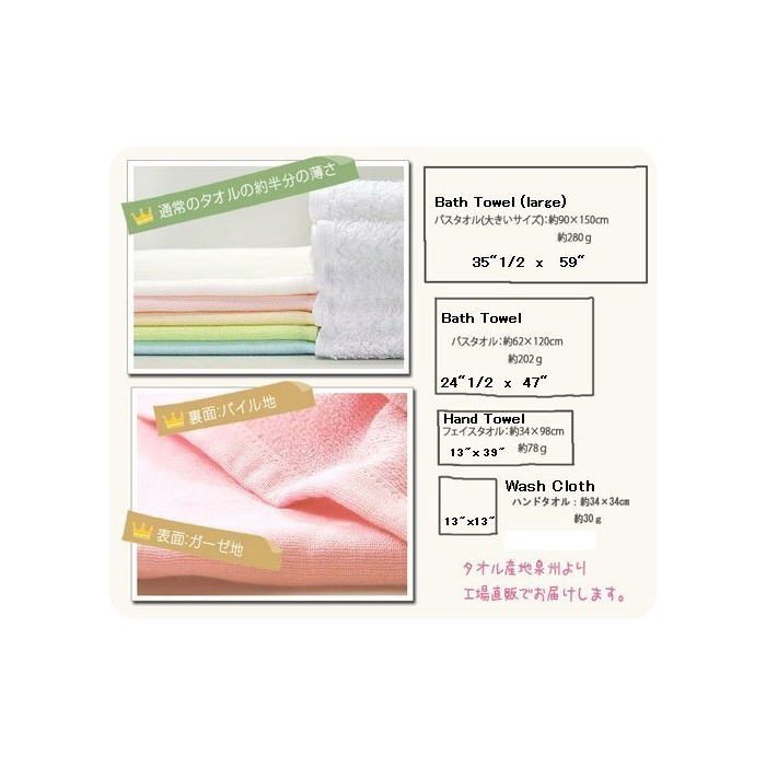 시판 거즈 타올보다(부터)도 가늘어 부드러운 실을 사용 하고 있으므로 부드럽고 피부에 친절한 사용감.타올의 산지,센슈에서 짜 올려진 일본제입니다.