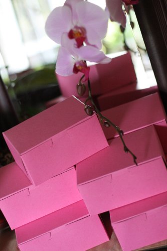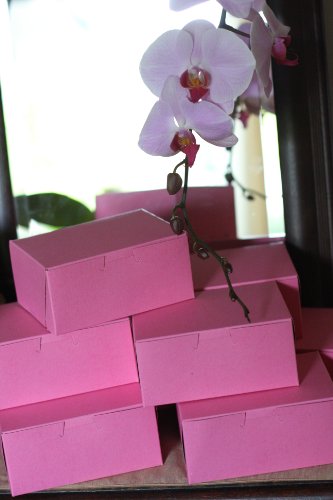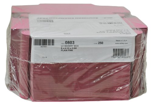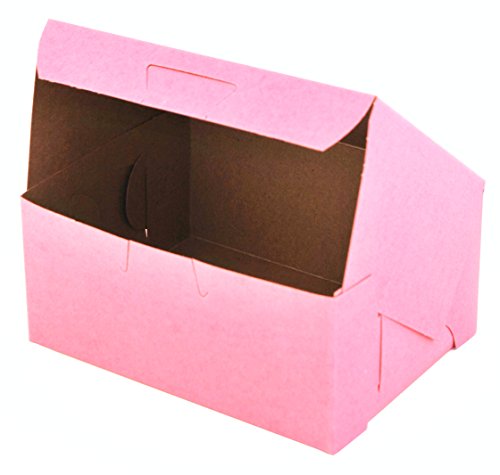 The Southern Champion Tray 0803 bakery box is made of clay-coated kraft paperboard, is pink on the outside and brown on the inside, has an attached tuck-in lid, and can be used to hold and carry baked goods. Paperboard is thicker and more rigid than paper, is suitable for holding baked goods, and can be recycled or composted. The clay-coated exterior can be printed with a logo or a business name. The attached lid tucks into the box to help secure its contents. The lock corners facilitate assembly and enable the box to be folded flat for storage or transport. The box measures 6 x 4-1/2 x 2-3/4 inches (L x W x H). (L is length, the horizontal distance from front to back; W is width, the horizontal distance from left to right; H is height, the vertical distance from lowest to highest point.)