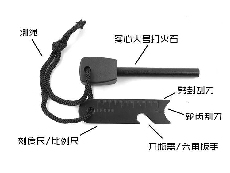 功能:打火石、比例尺/刻度尺、开瓶器、扳手。