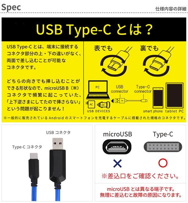 | 仕様 | 対応機種:Type-Cポート搭載の機器 2.4A対応 【本体コネクタサイズ】 Type-Cコネクタ:約H36×W11×D7mm USBコネクタ:約H57×W18×D11mm |