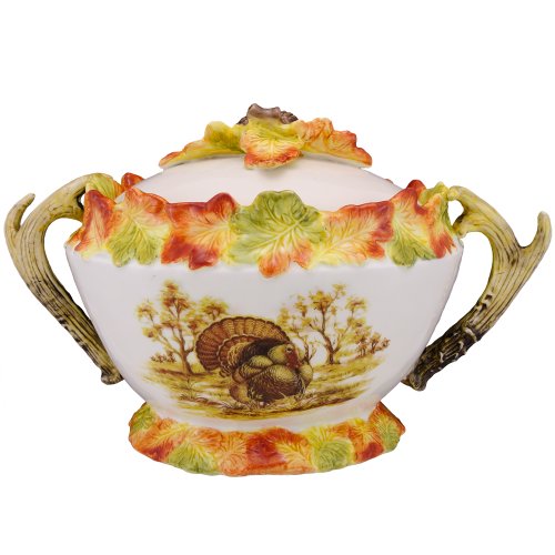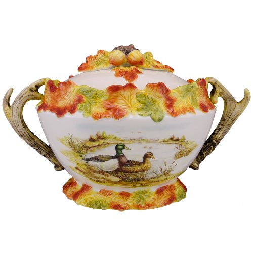 Studio : Lily Creek Publisher : Lily Creek Product Description This beautiful ceramic tureen displays two decal scenes, front side showing two ducks and the back side showing a turkey, bordered top and bottom with figurative hand painted leaves along with two antler handles, acorns and leaves on the lid 0