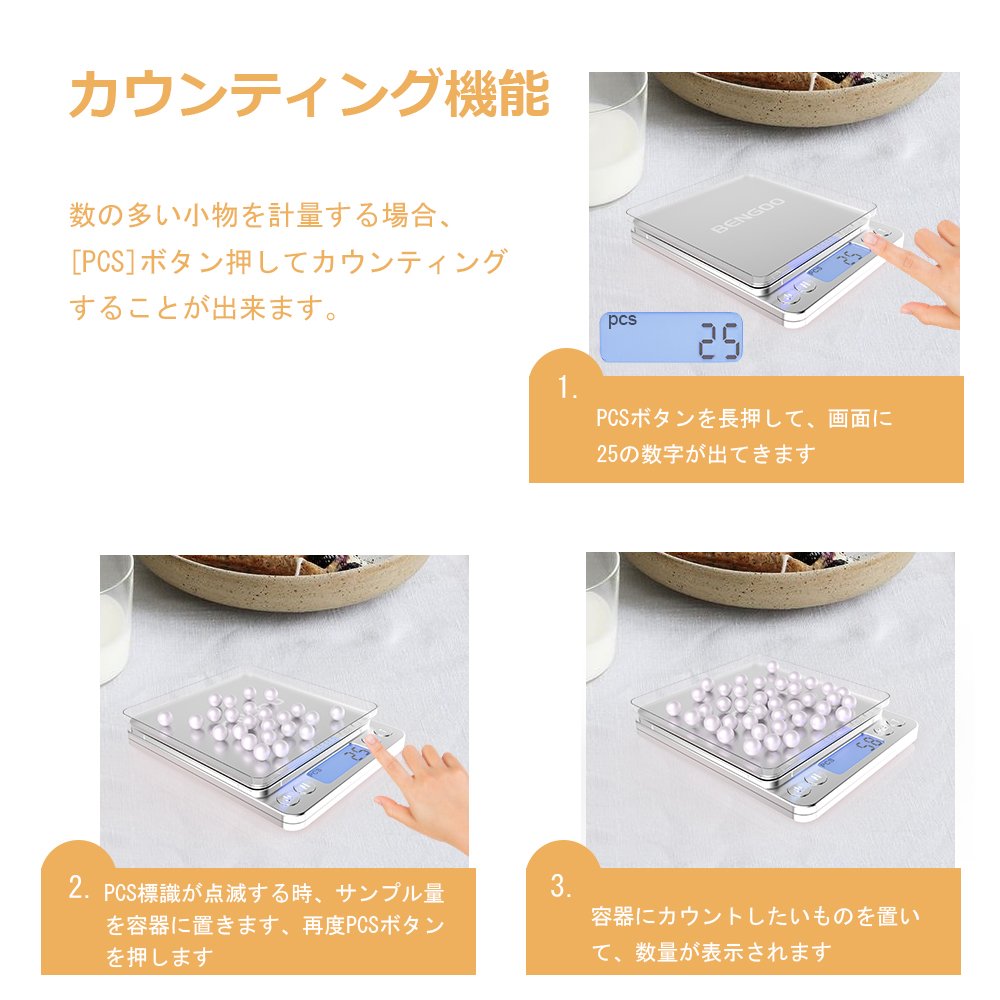 When weighing the same small items with many numbers, you can measure the number by pressing the [PCS] button.