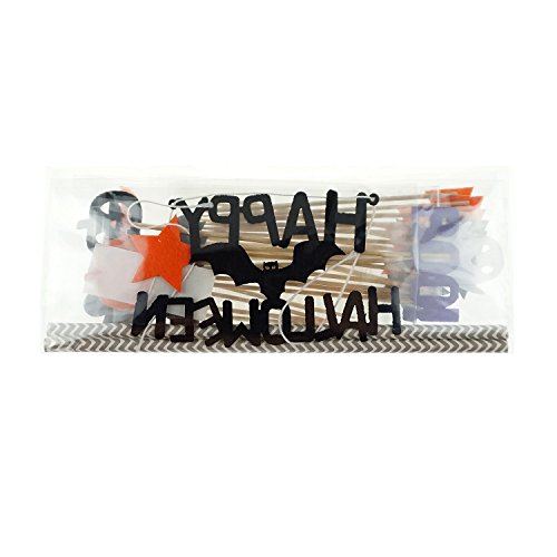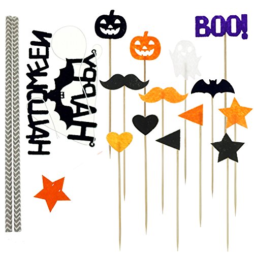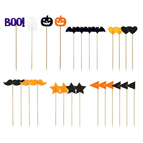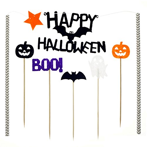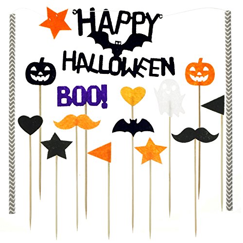 - A total of 27 Halloween party cake decorations supplies. Includes 1 "Halloween happy" monogram cake topper flags, also includes 26 Cupcake Picks decorations: 1 ghosts, 1 "BOO!", 2 Halloween pumpkins, 4 bats, 4 beards, 4 stars, 4 hearts and 6 pennants.
