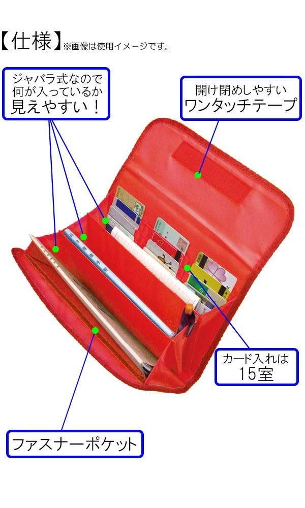 | 仕様 | カード収納枚数:15枚 ファスナーポケット:1つ ジャバラ式ポケット:1つ(3室) |