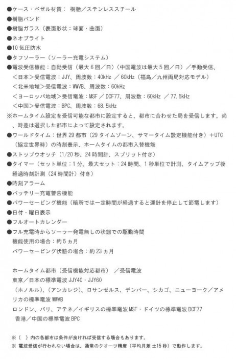 | 仕様 | 適応サイズ(腕まわり):14.5~21.5cm 使用電池:ソーラー充電電池(内蔵) 電池寿命:約7~10年 |