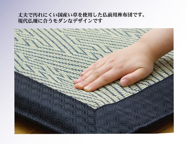 お盆の準備や、新しくご仏壇をご購入された方にお勧めの御前座布団です。側地には国産(九州産)のい草を使用しています。一本一本が太く、表皮が厚く繊維がキメ細かいので弾力性があり、耐久性に優れています。い草には空気の自然浄化作用、湿度の調節作用などがあります。また汚れにくく、使用するうちに黄金色に変化し味が出ます。い草に青森ヒバ加工を施しています(抗菌、防臭効果)。