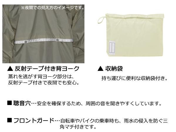 | メッシュ裏地で蒸れにくく、サラッと快適です。視野の広がる回転フードで、袖口は二重構造になっているので雨水の侵入を防ぎます。背部ヨークに反射テープが付いておりますので、夜間でも安心です。フードは取り外すことができます。持ち運びに便利な収納袋付き。 |