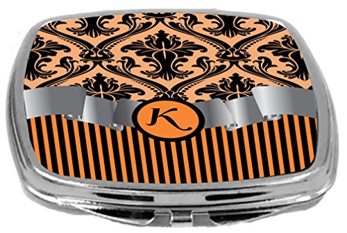 Rikki Knight Compact Mirror, Letter k Initial Orange Damask and Stripes