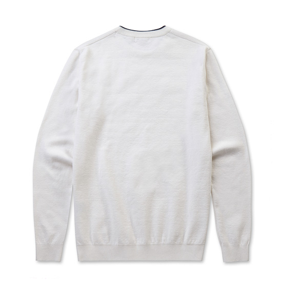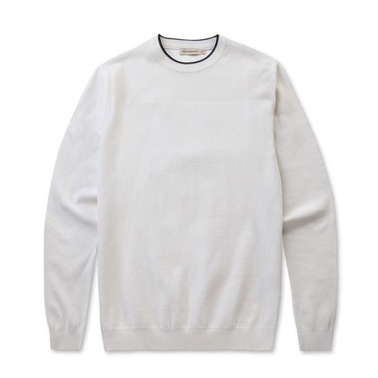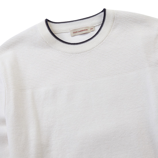 - 탑 니트 조직 콤비와 넥 라인 배색으로 포인트를 준 남성니트.