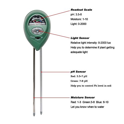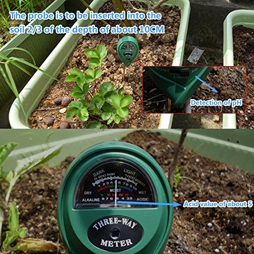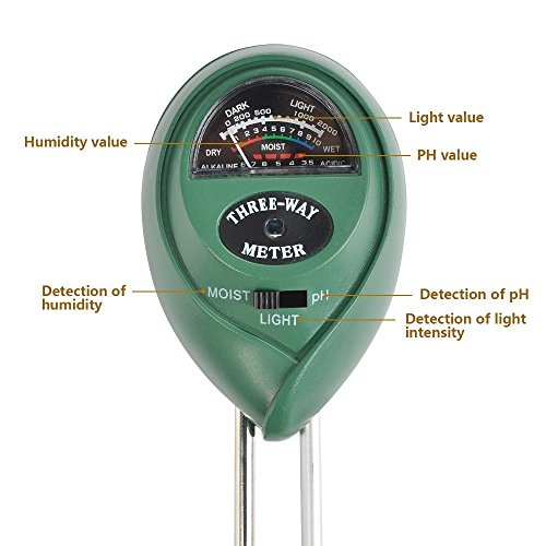 -. Feature : 【3 in 1 Soil Tester Meter】The meter has three scales and a slide switch that measures light, moisture or pH, work well indoor or outdoor, make your plants grow healthy and strong / 【Accurate & Easy to Read】Keep it in the soil for 10 minutes will give an instant answer and must be read in the soil, the instrument will automatically reset and needn't any calibration / 【How to Use】No batteries needed, insert the probe into a depth of 10 cm, switch to the setting you want to measure and read the scale (the soil tester test wet soil not the water) / 【Professional Soil Tester】ATPWONZ soil testing equipment ideal for individuals and companies use in lawn, potted, indoor plant or any soil / 【Important Tips】To avoid damaging the electrode, please clean the electrode after each use, do not use in soil with stones and insert forcibly, design for testing soil ONLY