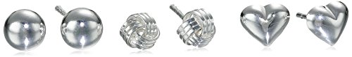 Three pack of sterling silver stud earrings featuring ball, love knot, and heart
