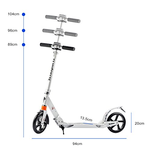-. Feature : Rubber handles, anti-slip, safe to grip. Foldable structure for minimizing the size to stay in a corner or in a bag. / Adjustable height with three levels (86cm, 96cm and 104cm) with wider applications for different groups of people. / Scooter equipped with a locking system, which makes the vehicle more stable. The brake and mudguard system are combined in one piece, more convenient and safe to ride on damp roads. / Maximum load: approx.100 kg. Adjustable Height: approx.86cm, 96cm and 104cm/ 33.9", 37.8" and 40.9". / Diameter of the wheel: approx.20cm/7.9". Total Length: approx.94 cm/37".