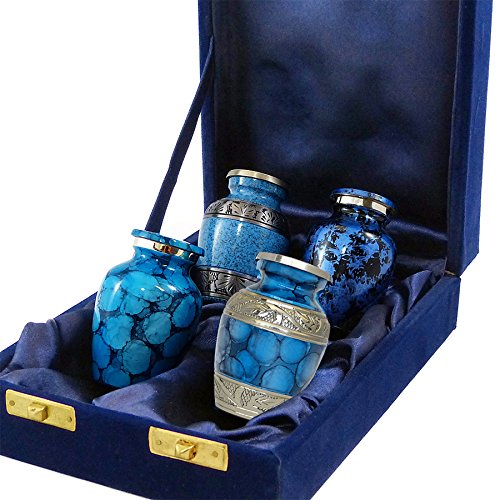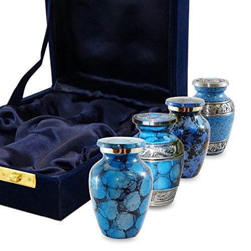 Trupoint Memorials Set of 4 Classic Blue Forever Remembered Unique and Beautiful Mini Cremation Keepsake Urns. This Set Is Meant To Share Your Loved Ones Remains Among Family and Friends As A Loving Remembrance.