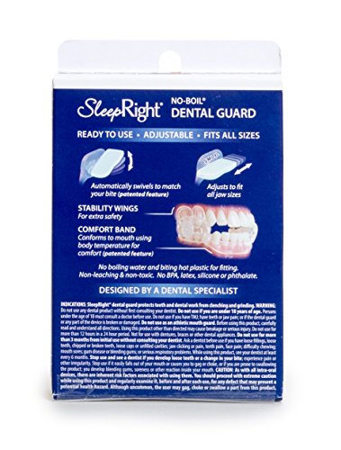 ReleaseDate : 2012-07-22 Studio : SleepRight Publisher : SleepRight Binding : Health and Beauty Product Description Typical dental guards require boiling water and biting into hot plastic for fitting. SleepRight does not. With SleepRight's patented self-adjust dental night guard technology, you have two bitepads that comfortably fit between your upper and lower molars to re-establish your natural freeway space. The bitepads have four positions, making it easy to customize the fit for all sizes. They adjust forward for a smaller fit and backward for a larger fit, as well as swivel to match the angle of all bites. 0