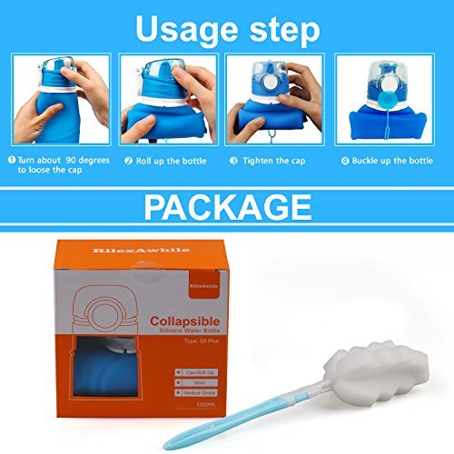 Collapsible Water Bottle, RilexAwhile 35oz 1000ml Silicon Foldable 100% Leakproof Bottle with FDA and SGS Certified, BPA Free for Traveling, Mountaineering, Camping with Free Cup Brush