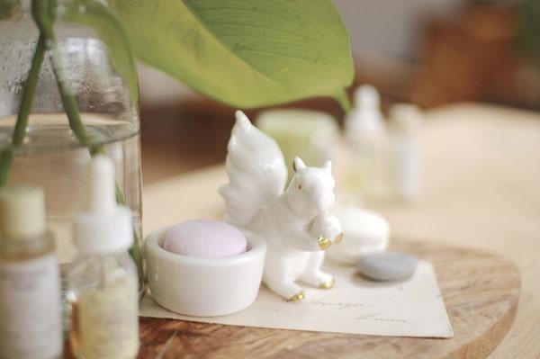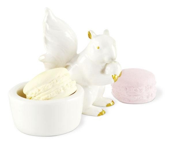 | 見ているだけで楽しくなりそうなリスが遊ぶ磁器トレイに、とってもスイートなマカロンのアロマストーンがちょこんと乗っています。お好みのアロマオイルを垂らしてお楽しみください♪ |