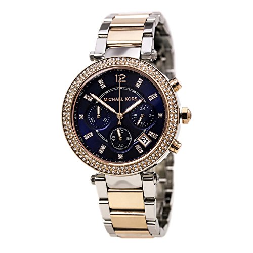 Studio : Michael Kors Publisher : Michael Kors Binding : Watch Product Description Rose Gold-tone stainless steel case with a two-tone (silver and rose gold-tone) stainless steel bracelet. Fixed rose gold-tone bezel set with crystals. Blue dial with rose gold-tone hands and crystal index hour markers. Arabic numeral marks the 12 o'clock position. minute markers around the outer rim. Dial Type: Analog. Date display between 4 and 5 o'clock positions. Chronograph - three sub-dials displaying: 60 second, 30 minute and 24 hour. Quartz movement. Scratch resistant mineral crystal. Pull / push crown. Solid case back. Case diameter: 39 mm. Case thickness: 11 mm. Round case shape. Band width: 20 mm. Deployment clasp. Water resistant at 50 meters / 165 feet. Functions: date, day, hour, minute, second, 24 hour. Casual watch style. Michael Kors Parker Mini Chronograpg Blue Dial Two-tone Ladies Watch MK6141. 0