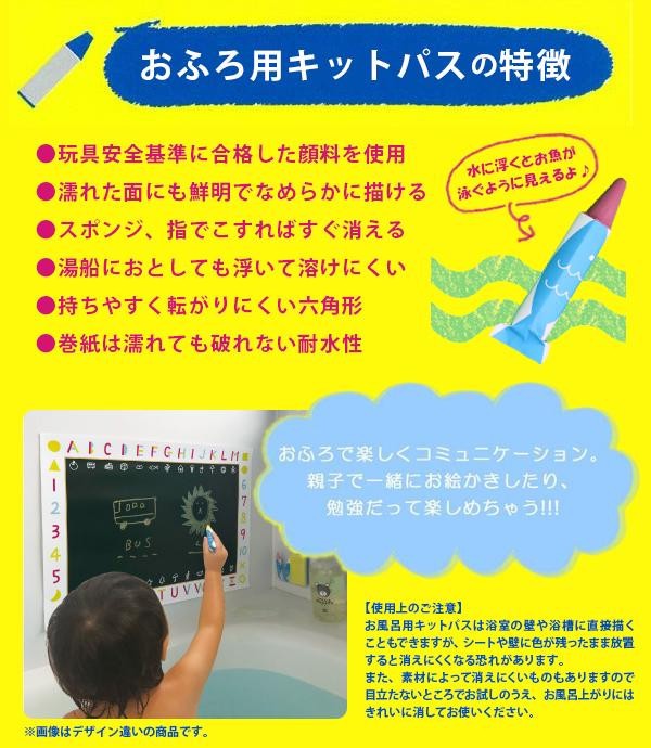 浴室の壁に貼って自由にお絵かき、お勉強ができる「おふろシート」と濡れた面にも使える「おふろ用キットパス」のセットです。スポンジで簡単に落ち、繰り返し書くことができます。 |
