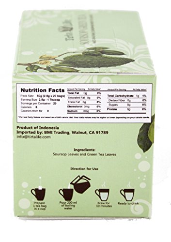 - Feature : Premium Soursop Leaves Masterfully Blended with High Quality Green Tea. Acetogenins & Antioxants in Perfect Harmony.. / Tirta Life Soursop Tea is made only from premium grade 100% pure & natural leaves, free of pesticides and chemicals / Our Soursop leaves are handpicked to ensure you get only the best quality leaves from deep inside the pristine rainforests of Indonesia / We use state-of-the-art drying and sterilization procedures to preserve the highest content of acetoginins and antioxidants possible / We pack more leaves in our tea bags; 2.5 grams compared to the standard 2 grams